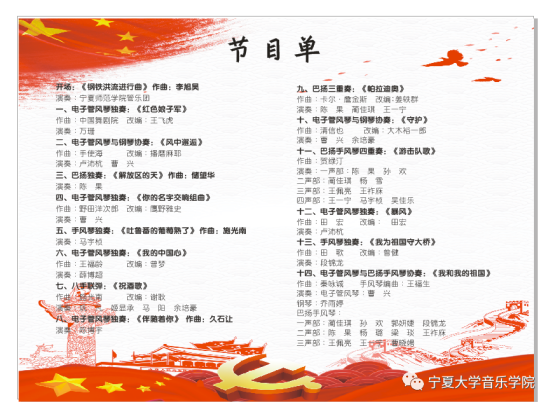 当夕阳沉睡,黑夜包围大地的时候,音乐厅却格外热闹,雨天的寒意并不会影响同学们对音乐会的热情。伴随着灯光的亮起,开场作品《钢铁洪流进行曲》以辉煌的旋律拉开了音乐会的帷幕,两位主持人向大家介绍了现场观看音乐会的各位老师、领导,并对他们表示热烈的欢迎,接着,电子管风琴与巴扬手风琴的接连上演,给大家带来视觉与听觉的冲击。最后,当《我和我的祖国》的旋律响起,此次音乐会圆满结束。