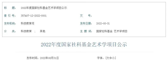 根据《国家社会科学基金管理办法》《全国艺术科学规划项目管理办法》的有关规定,现将2022年度国家社科基金艺术学拟立项项目予以公示。公示时间为2022年8月31日至9月6日。公示期内,如有异议,请以书面方式向全国艺术科学规划领导小组办公室反映,并提供必要的证据材料,以便核实查证。提出异议者须提供本人真实姓名、工作单位、联系电话等有效联系方式(我办将予以严格保密),凡匿名、冒名、超出期限或其他形式反馈的异议不予受理。