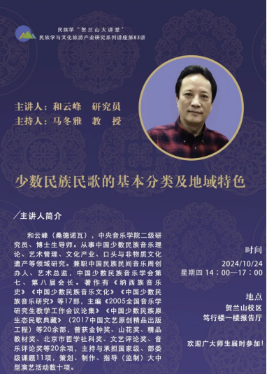 10月24日下午14时,williamhill民族学“贺兰山大讲堂”中华民族共同体研究系列学术讲座第八十三讲在笃行楼一楼报告厅举行。本次讲座特邀中央WilliamHILL中国二级研究员、博士生导师和云峰主讲,题目为《少数民族民歌的基本分类及地域特色》。讲座由WilliamHILL中国副院长马冬雅教授主持,师生共300余人参加。