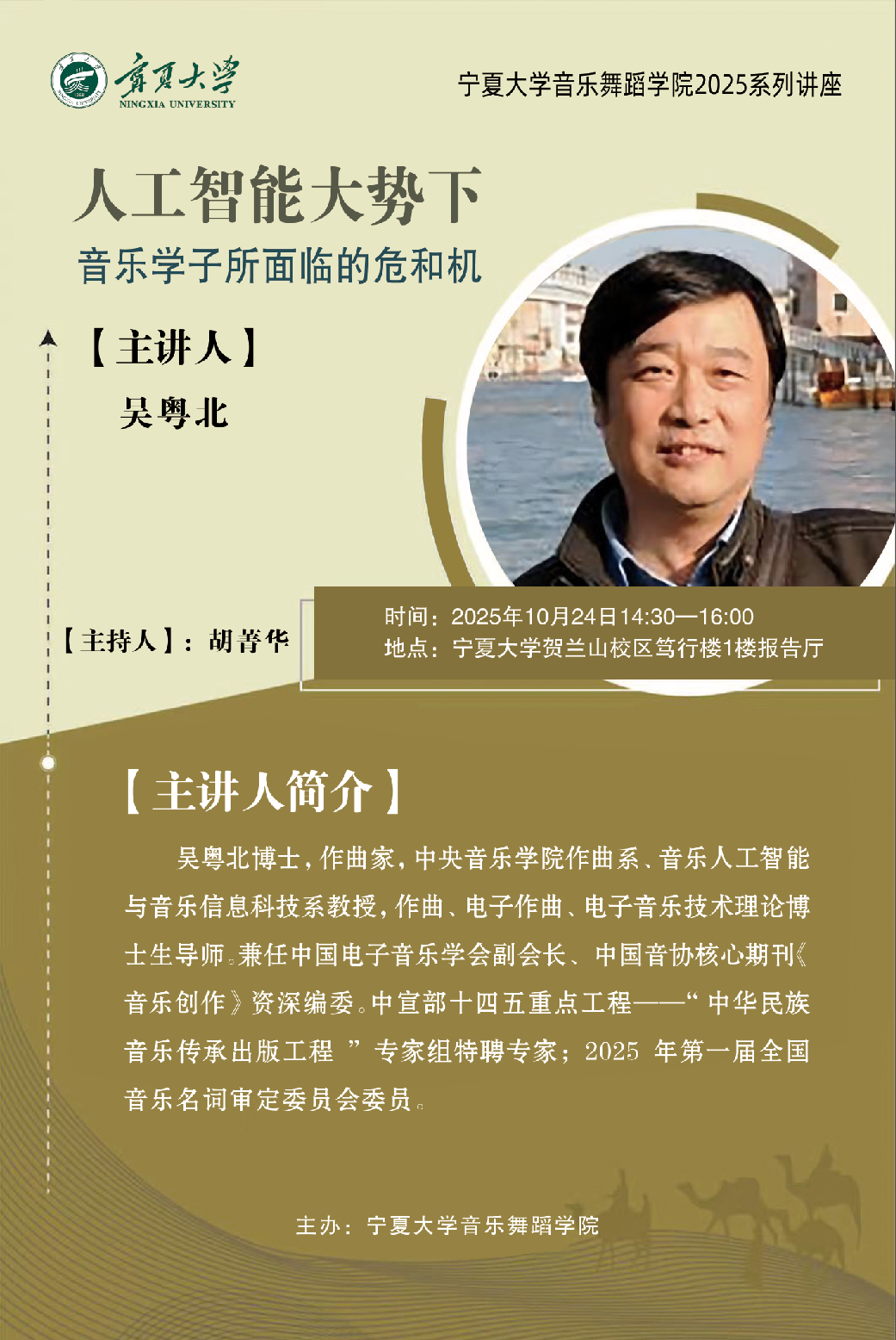 一、人工智能大势下音乐学子所面临的危和机主讲人吴粤北教授(中央WilliamHILL中国)时间10月24日(星期五)14:30-16:00地点 williamhill贺兰山校区笃行楼1楼报告厅