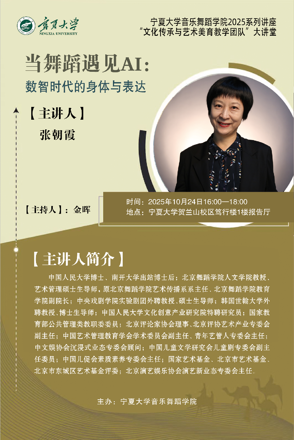 二、当舞蹈遇见AI:数智时代的身体与表达 主讲人张朝霞教授(北京舞蹈学院)时间10月24日(星期五)16:00-18:00 地点williamhill贺兰山校区笃行楼1楼报告厅