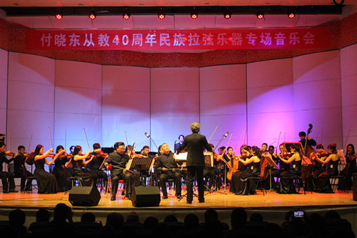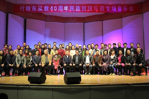 在整场音乐会中,付晓东教授分别运用艾捷克、二胡、四胡、马头琴、中胡、雷琴、板胡、京胡、坠胡和高胡10种不同的民族拉弦乐器和他的学生共同演奏了《二泉映月》《战马奔腾》《梁山伯与祝英台》等经典曲目。这些乐器既具有汉族传统乐曲,又有维吾尔族、蒙古族等少数民族的代表性乐曲。他以各种不同的弓法、指法等技巧塑造出多种多样的音乐形象,其柔和的音色、富有歌唱性的旋律、极具细腻、表现力的演奏,给观众呈现了中国民族拉弦乐器视觉盛宴,赢得全场热烈的掌声和赞誉。付晓东教授长期从事民族拉弦乐器的研究、制造、改良和教学,在国家学术核心期刊、中国《乐器》等专业杂志发表学术论文二十余篇,其中《“二泉映月”二胡演奏技法深浅》获中国教育论坛优秀学术成果奖。他从教40年,教学严谨、精于钻研、因人施教,学生遍布宁夏山川,有的成为区内外民族拉弦乐器的佼佼者。