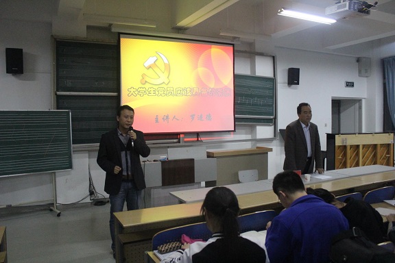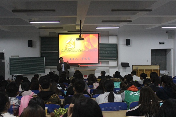 罗进德老师分别从“党的历史”、“党的阶级性”、“党的方针与路线”以及“四个全面”等内容进行介绍与分析。讲座内容丰富有趣,语言幽默诙谐,言辞铿锵有力。罗进德老师还讲到了我们要“不忘初心,继续前行”,要求我们大学生党员要有正直的品行,高尚的节操,要起到带头模范作用。