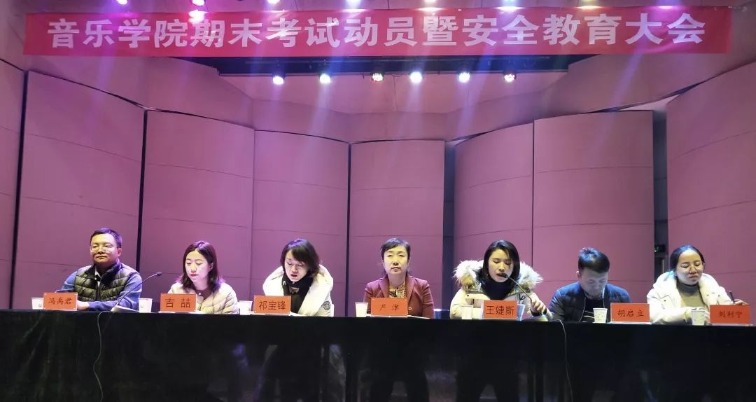 大会在庄严的奏唱国歌声中开始。会上刘利宁老师宣读并阐释了《williamhill学生考试违规处理办法》,鼓励同学们要充分做好考前复习,严格遵守考试纪律,切实做到诚信应考,争取考得理想成绩。吉喆老师就期末考试时间安排、教务平台成绩查询方法以及下学期开学初的缓考、补考、重修等事项进行了详细说明。王婕斯老师、祁宝峰老师、吉喆老师在会上对钢琴系、声乐系、器乐系的期末考试注意事项及主修二类考试制度进行了解读。