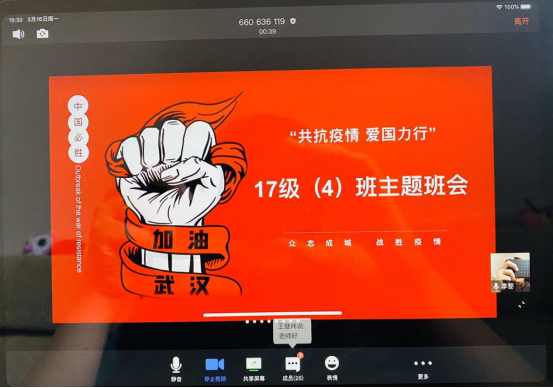 在各班的线上主题班会上,同学们踊跃发言、认真讨论,就“大学生应如何参与疫情防控的人民战争、该如何担负起自己的使命和责任”这一主题展开了学习交流。重点疫情地区学生代表就前段时间收到学校的来信发表感想,均表示一定不负学校、老师的叮嘱和期望,身体力行为打赢疫情防控阻击战贡献微薄的力量;志愿服务下社区学生代表向同学们分享了投身战“疫”的宝贵经历,表示在防疫抗疫实践中真正深化了爱国之情、强化了强国之志,并号召身边同学们今后有机会一定多投身于志愿服务活动;学生干部代表就疫情防控期间如何更好地发挥先锋带头作用、如何更好地服务班级和同学作了发言。