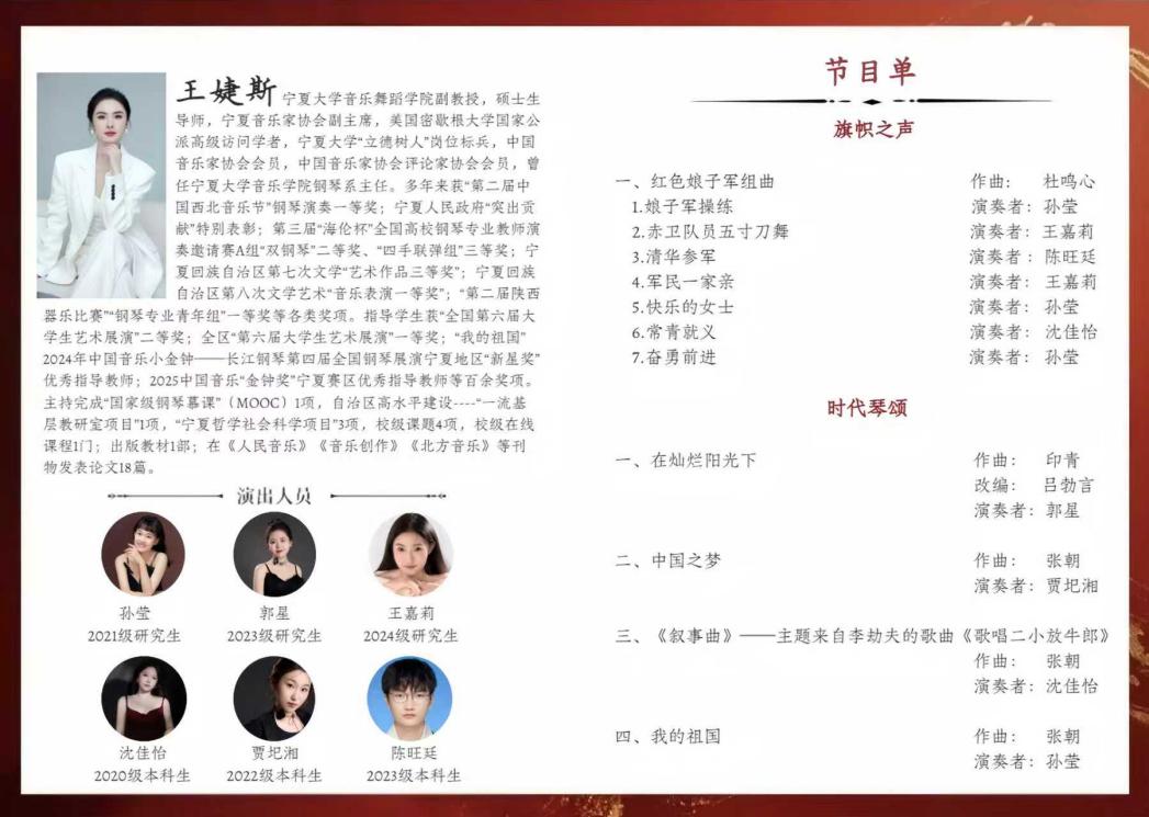 以音为旗,传递信仰力量;以琴为笔,书写时代华章,这不仅是一场音乐会,更是一堂生动的音乐思政课。在王婕斯老师教学21年之际,谨以“旗帜之声·时代琴颂——中国红色钢琴作品礼赞”教学汇报音乐会奉献给伟大的祖国母亲。