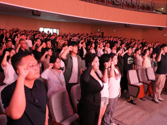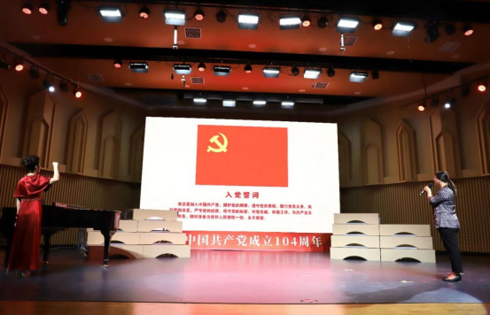 音乐党课在雄壮的国歌声中拉开帷幕。在张永丽的领誓下,全体师生党员面向党旗,庄严肃立,举起右拳,重温入党誓词。