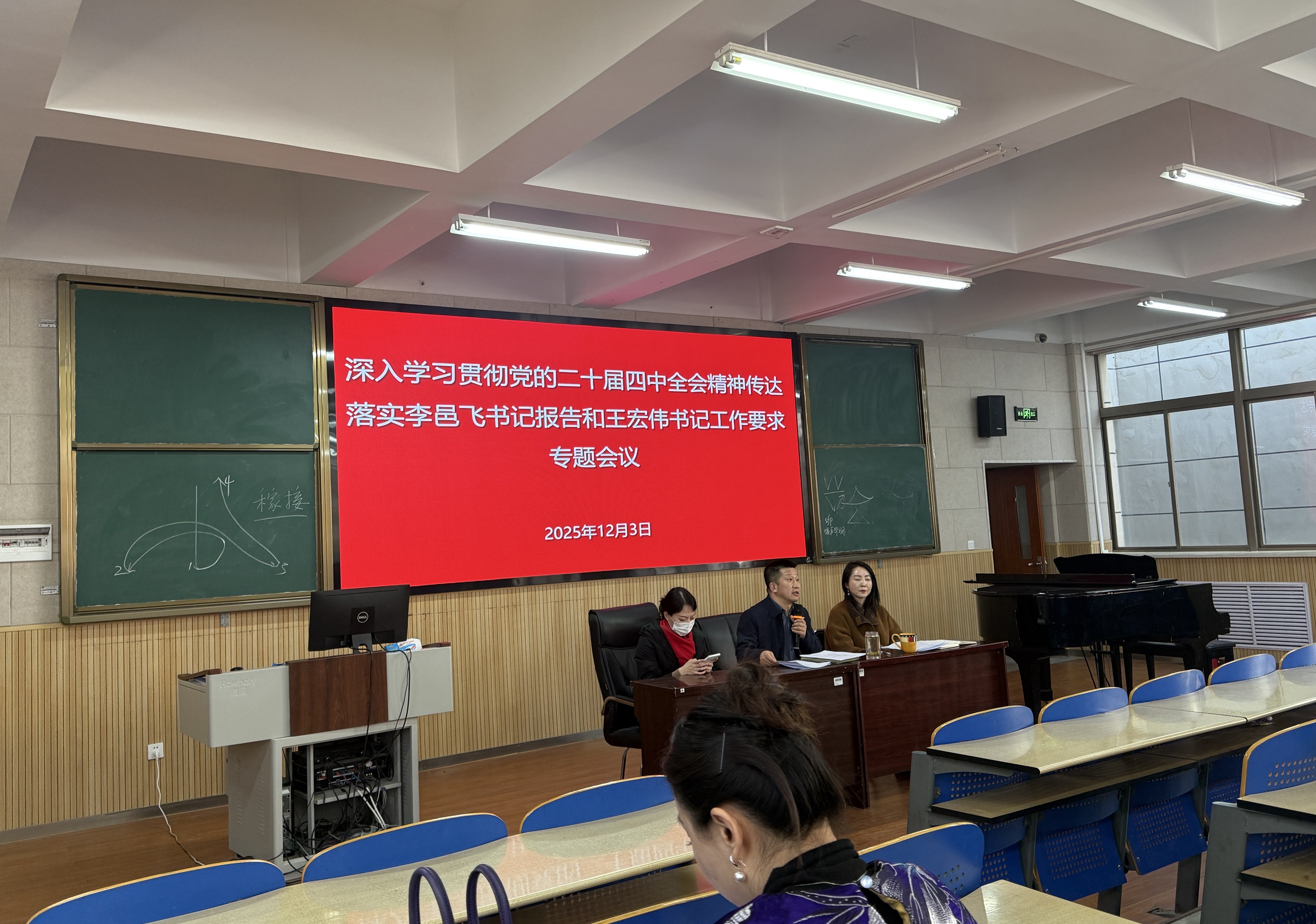 2025年12月3日下午,音乐舞蹈学院召开全院教职工大会,传达学习贯彻自治区党委书记李邑飞同志在williamhill调研宣讲时的重要指示精神,以及校党委书记王宏伟同志的相关部署要求,结合实际全面安排校园安全稳定、法治宣传教育与师德师风建设等工作。会议围绕落实立德树人根本任务、推动学院内涵式高质量发展进行深入研讨,进一步统一思想、凝聚共识、明确重点、压实责任,为学院各项事业稳步推进奠定坚实基础。